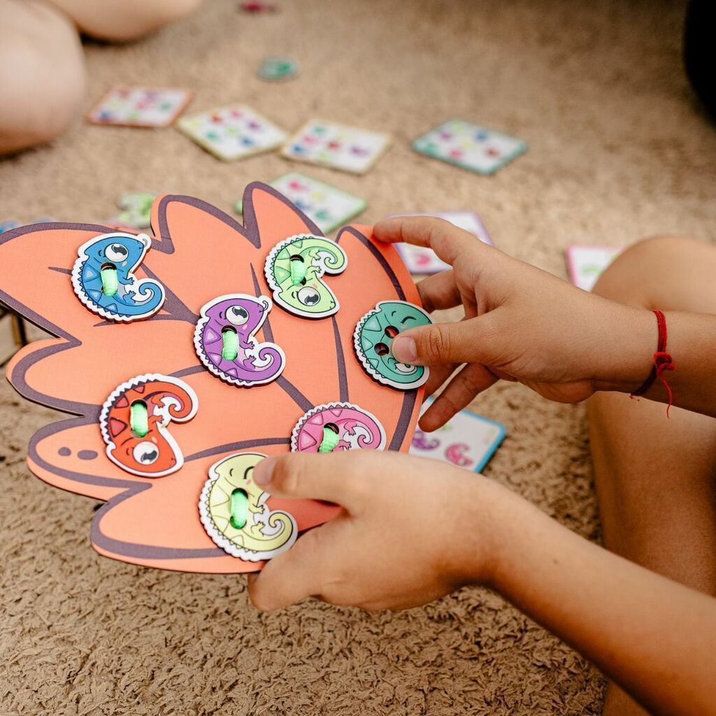 A atividade de alinhavar exige foco e paciência, ajuda a melhorar a atenção e concentração das crianças.