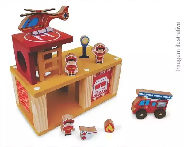 01 brinquedo em madeira (MDF e Pinus) medindo 310mm X 236mm X 170mm (montado) e 08 peças em MDF de tamanhos variados representativo de 03 bombeiros, 01 helicóptero, 01 caminhão, 01 refletor, 01 chama e 01 extintor.