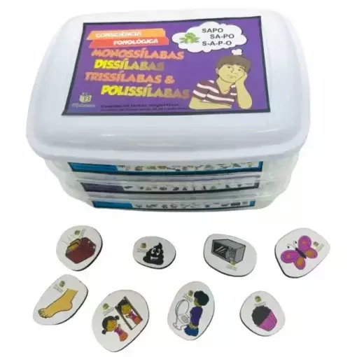 60 fichas magnéticas divididas em figuras com palavras monossílabas, dissílabas, trissílabas e polissílabas