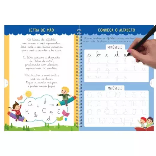 Este livro contém atividades que ensinam a escrita da letra cursiva. A tinta especial da caneta faz com que o livro seja reutilizável: depois de um tempo, ela apaga sozinha e com isso a atividade pode ser praticada muitas vezes. As páginas são em baixo relevo, o que facilita o contorno das letras..