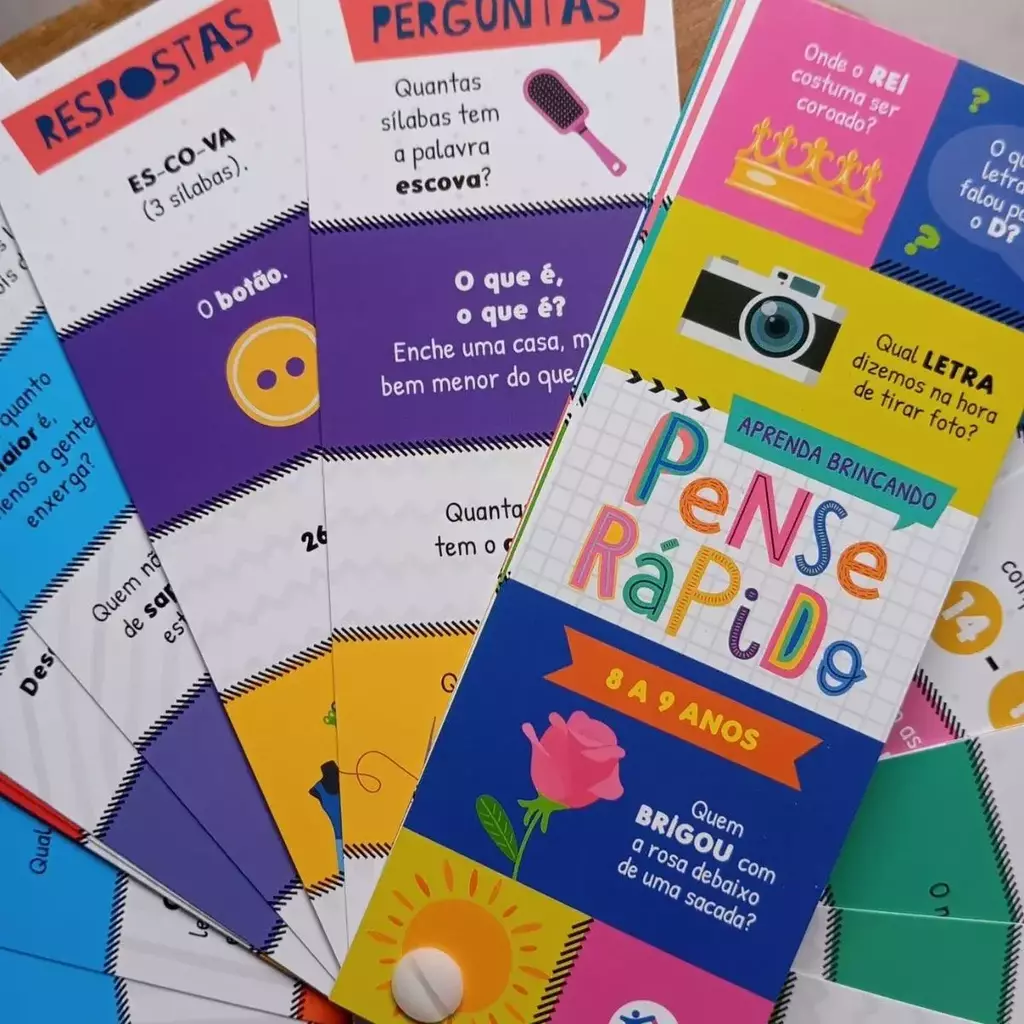 "Explore o emocionante jogo Pense Rápido 8 a 9 anos, repleto de perguntas estimulantes e ilustrações envolventes para idades a partir de 8 anos. Desafie o cérebro, promova o desenvolvimento cognitivo e divirta-se enquanto aprende. Ideal para interação em família, adultos podem participar lendo as perguntas.