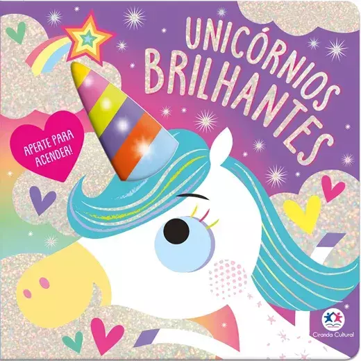 Os unicórnios mostram para você um mundo cheio de cores e diversão. Aperte o botão para ver o chifre mágico do unicórnio acender em cada página encante-se.