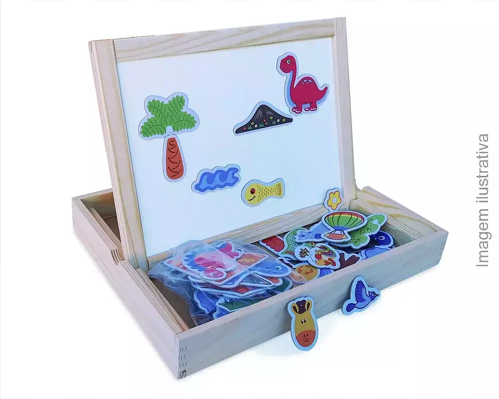 01 lousa dupla face (um lado para escrever e desenhar com giz e outro lado próprio para fixar as peças imantadas, criar cenários e personagens para contar histórias).