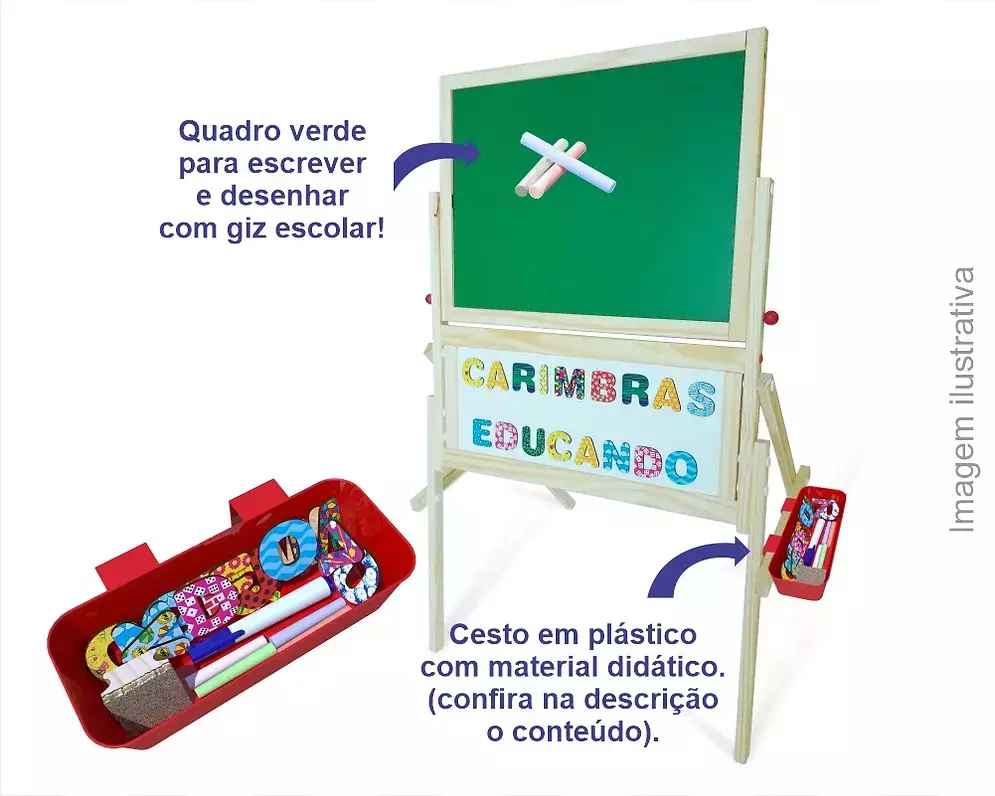 01 conjunto medindo 1000mm de altura, com 01 quadro dupla face com 01 lado para escrever com marcador e outro lado com giz, medindo 540mm X 400mm X 15mm, 01 quadro para fixar imantados medindo 540mm X 260 X 15mm, 54 letras e números decorados medindo 48mm de altura, 01 pincel para quadro branco, 01 apagador, 04 gizes coloridos, 01 cesto em plástico para acomodar as peças. 01 manual explicativo.