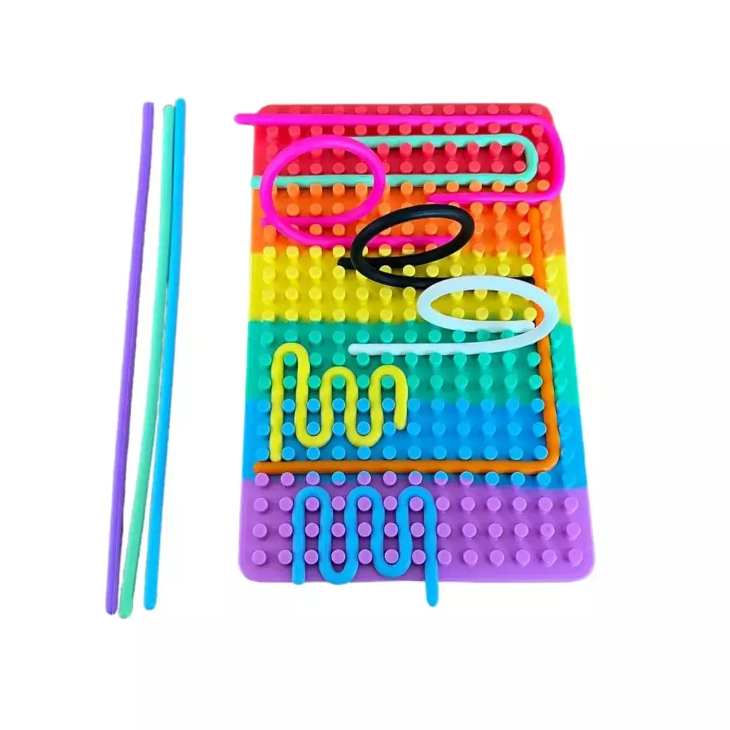 Um brinquedo educativo e relaxante que combina coordenação motora fina, criatividade e estímulo sensorial! Com uma base de silicone flexível cheia de ranhuras e 11 cordas de silicone, as crianças podem explorar diferentes padrões e formas ao encaixar as cordas nas ranhuras. Ideal para aliviar o estresse, desenvolver habilidades motoras e proporcionar uma experiência tátil envolvente. Perfeito para crianças e adultos que buscam momentos de concentração e relaxamento!